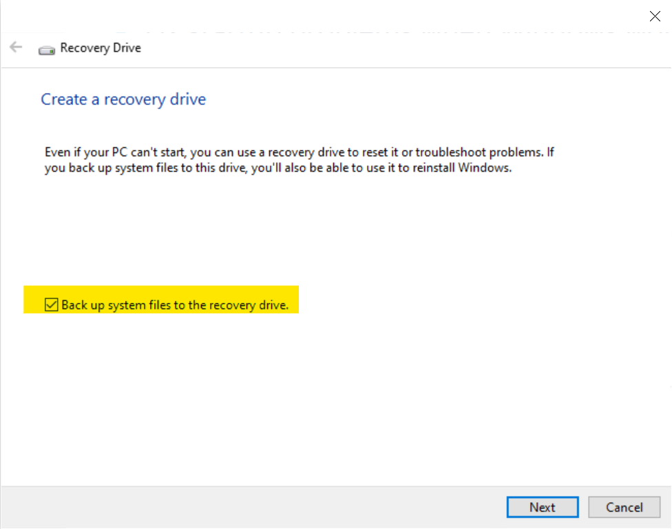 Check "Back up system files" (optional but recommended). This allows you to reinstall Windows from the recovery drive. Requires a larger USB (32GB+).