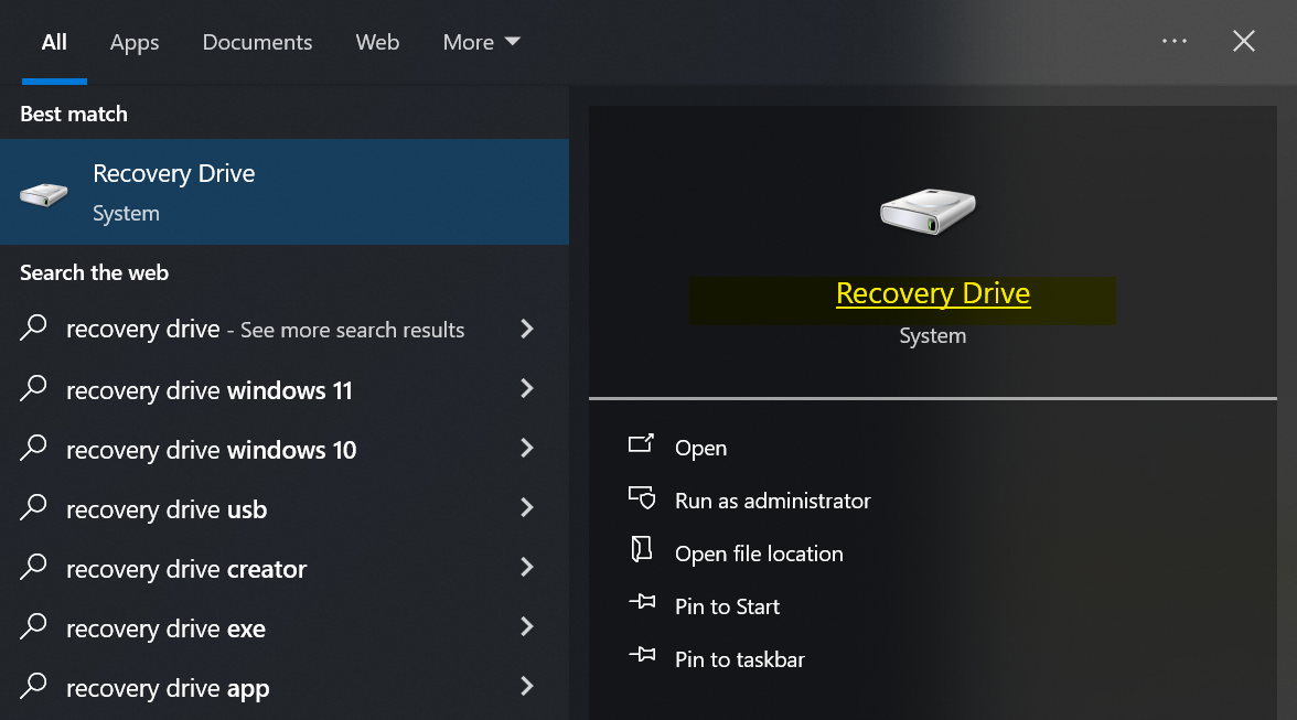 Open Recovery Drive tool: Press Windows + S
