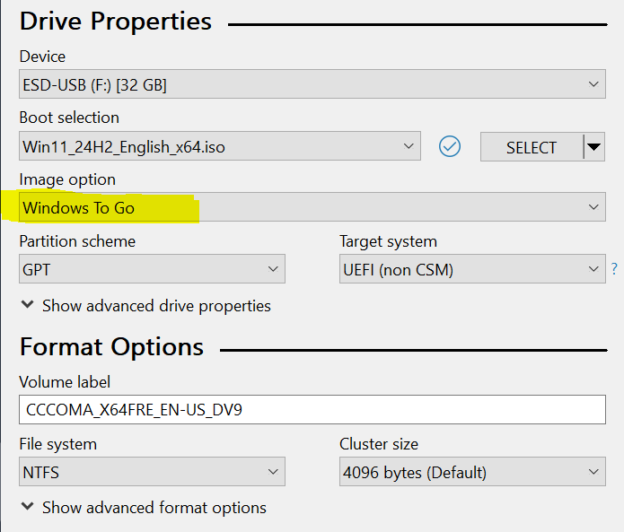 Launch Rufus and connect your USB drive, then Configure Rufus settings: