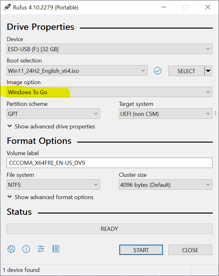 In Rufus, select "Windows To Go" option, choose your SSD, and select the ISO file. This creates a specialized portable installation.