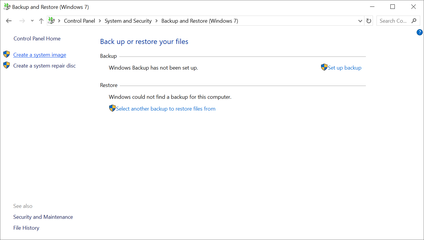 Open Control Panel and navigate to System and Security > Backup and Restore (Windows 7).
