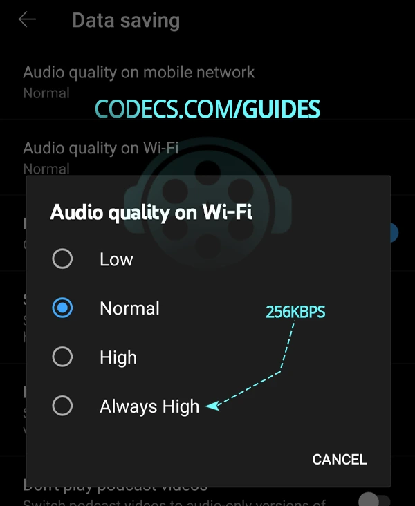 - Navigate to Settings → Data saving → Audio quality on Wi-Fi.